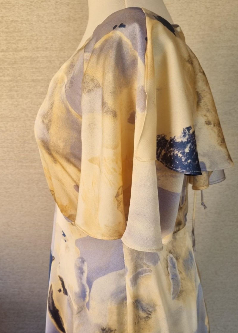 Flattering sleevs finish this floaty, sophistcated and comfortable dress which moved beautifully as you walk thanks to the clever cut which gives no bulk on the waist or hips but plenty of volume around the hem.