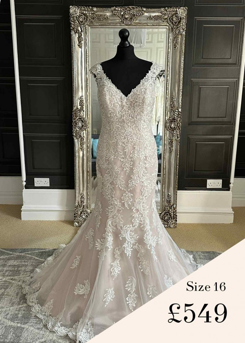 A romantic and feminine Stella York wedding dress. This size 16 trumpet gown features a flattering v-neckline and scoop back, adorned with opulent ivory lace over dusky pink blush satin.