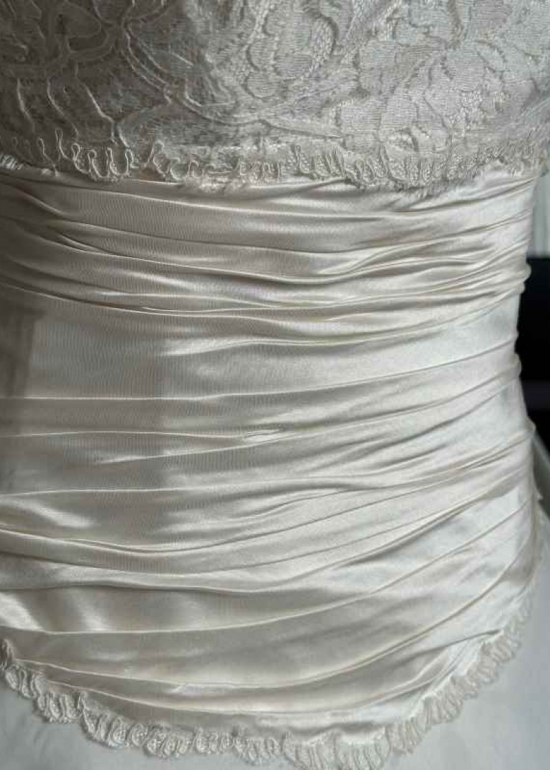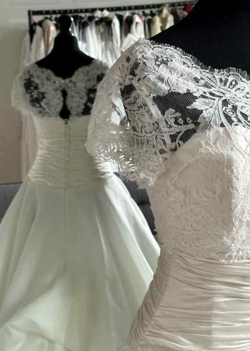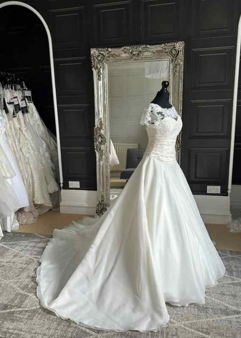 This is a gown for brides who want to look chic and timeless on their special day. Book an appointment to try it on and see for yourself how beautiful it is. All Tricker Bridal Déjà vu dresses are sold as seen and are non refundable.