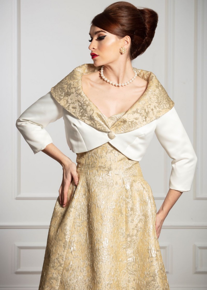Shown here in gold brocade, the dress and bolero can also be made in a variety of fabrics and colours.