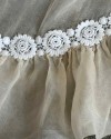 It has a flattering empire line silhouette with a slim column skirt that flows gracefully into a beautifully shaped train. The train, which attaches seamlessly into the side seams of the skirt, is a showstopper in its own right, edged with a deep ruffle that is delicately trimmed with daisy guipure lace—totally 70s.