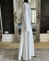 It's a demure A line with a semi empire line waist (the waist seams sits at the waistline at the back rising to a peak at empire line in the centre front.) The round necked bodice is embellished with silver and diamante detail which is all in perfect condition. Long fitted sleeves finish a perfect, early 1970s original.